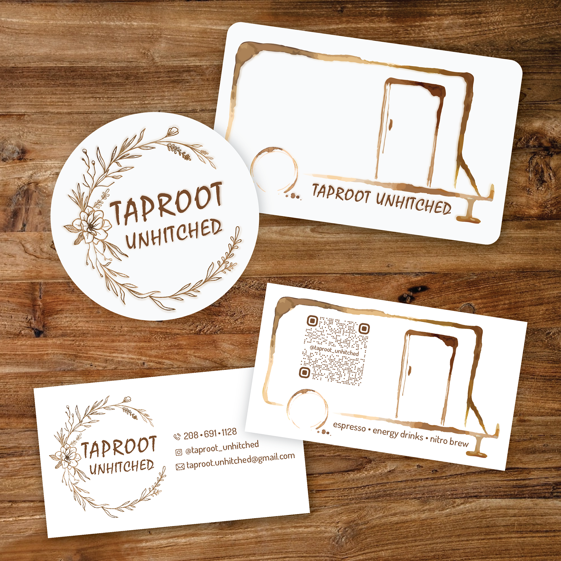 Stickers and business cards for a local mobile coffee cart operating out of a trailer. The trailer graphic was created using real coffee rings, bringing a playful, coffee-first energy that feels handmade, intentional, and true to the brand.